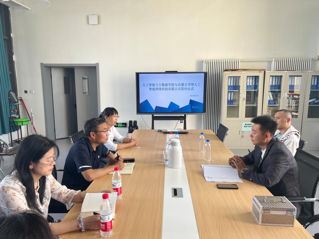 6月29日上午,在行知楼B215会议室,人工智能与大数据学院副院长耿卫江与内蒙古华智人工智能网络科技有限公司总经理常明进行座谈。
