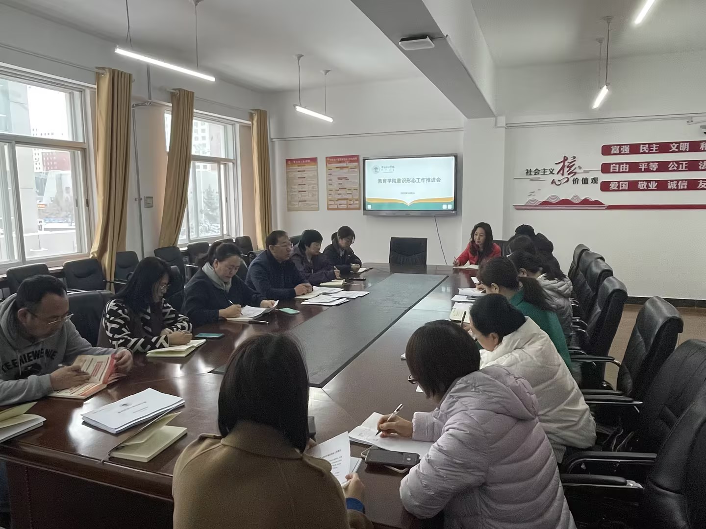 10月31日,教育学院在艺术楼210会议室召开2023年宣传思想意识形态工作专题会议。学院党总支书记海江主持会议,领导班子成员、各科室负责人、各党支部书记参加会议。