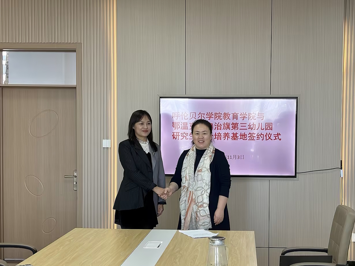为更好地适应教育硕士专业学位研究生教育实际,切实提高人才培养质量,11月3日上午,教育学院与海拉尔区幼儿园、海拉尔区第三幼儿园、鄂温克族自治旗第三幼儿园分别签署了研究生联合培养基地共建协议。学院党总支书记海江、院长李伟艳、副院长红霞、学前教育系主任杨丽丽、研究生办公室主任高玮玮,以及实践基地幼儿园领导参加了此次仪式。