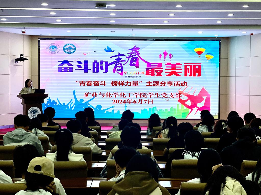 为发挥优秀学生的典型示范作用,释放青年学子的青春力量,培育时代新人,矿业与化学化工学院学生党支部于6月7日晚在崇文楼A201会议室举办“奋斗的青春最美丽‘青春奋斗 榜样力量’”主题分享活动。本次活动邀请到四位在学习科研、创新创业、公益服务等方面有突出成绩的榜样学子分享自己的成长经历和感悟,展现青春事迹与风采。学院党总支书记张阳,团学办副主任、团总支书记闫微,学院学生会全体成员、第二期青马班学员、2023级化学班、应用化学班全体学生共同参加活动。学生党支部书记孟庆永主持活动。