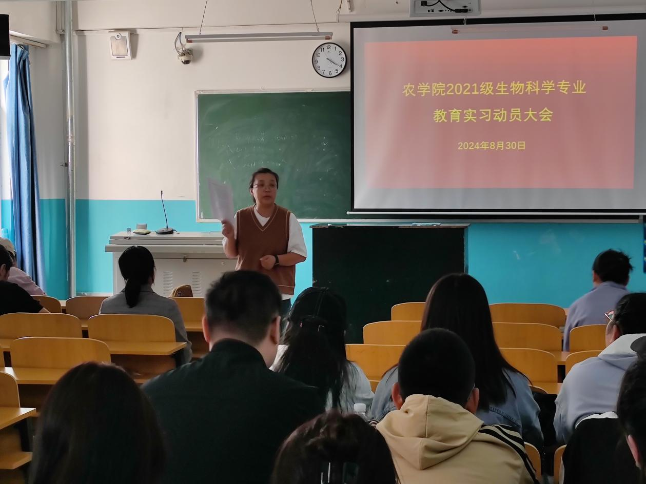 为保证2021级生物科学专业学生教育实习的顺利开展,农学院于8月30日在艺术楼201教室召开2021级生物科学专业实习动员大会。学院副院长肖燕子、专业负责人胡日查、实习领队教师胡达古拉、教师代表于若男及2021级生物科学专业全体学生参加会议。