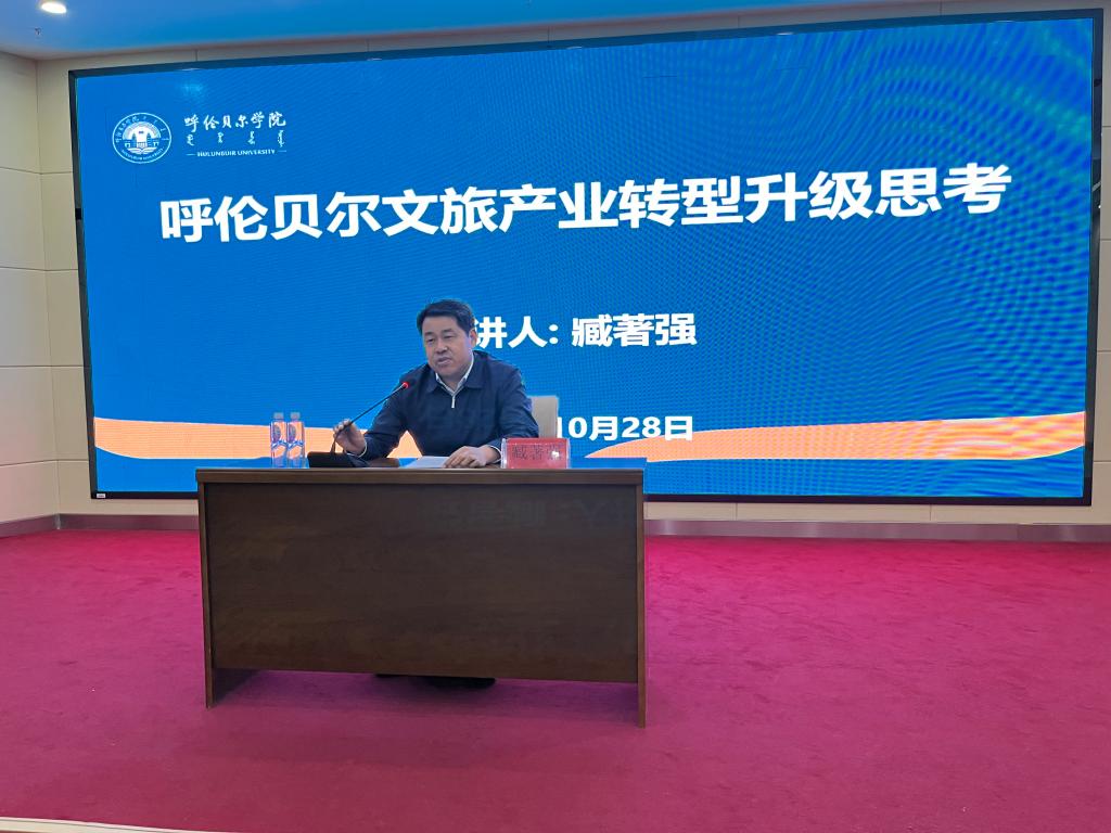 为加强旅游管理专业硕士点和国家级一流本科专业建设点建设,了解呼伦贝尔市旅游业发展最新动态,深化校地合作,10月28日,旅游地理与历史文化学院特邀呼伦贝尔市委宣传部副部长、呼伦贝尔市文化旅游广电局党组书记、局长、美加墨世界杯官网旅游管理硕士研究生行业导师臧著强在崇文楼A201会议室作专题讲座。本次讲座由旅游地理与历史文化学院副院长徐舒静主持,工学院副院长吴淘锁、旅游管理硕士点负责人亚吉、旅游管理研究生办公室主任杨燕燕及旅游管理硕士研究生导师、旅游学系专任教师、旅游管理硕士研究生、本科生共140余人聆听讲座。