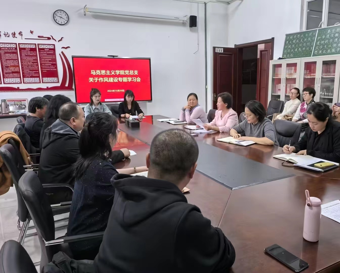 为深入学习贯彻党的二十届三中全会精神,进一步加强党风廉政建设,推进全面从严治党向纵深发展,10月30日下午,马克思主义学院党总支在崇文楼B座123会议室召开学院党总支关于作风建设专题学习会。学院党总支书记刘凤琴主持会议,全体教师参加学习。