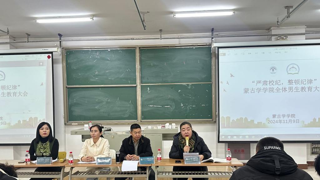 为进一步加强学生教育管理,培养学生良好的行为习惯与自我约束力,蒙古学学院于11月9日上午在崇文楼B401教室召开“严肃校规,整顿纪律”主题学生教育大会。学院党总支副书记孔春艳、团学办教师及学院全体男生参加,大会由辅导员乌日汉主持。