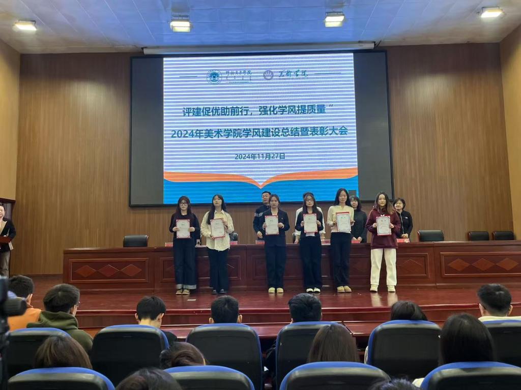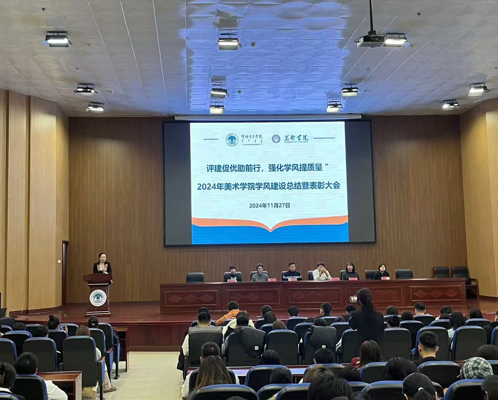 2024年,美术学院以习近平新时代中国特色社会主义思想为指导,以铸牢中华民族共同体意识为主线,全面贯彻落实党的教育方针,围绕立德树人根本任务,坚持“以评促建、以评促改、以评促管、以评促强”,突出内涵发展、特色发展与创新发展,挖掘出了众多优秀的成果与经验,美术学院于11月27日在图书馆四楼报告厅召开“评建促优助前行,强化学风提质量”学风建设总结暨表彰大会。美术学院领导班子成员、各系主任、团学办全体成员及各年级学生等四百余人参加了会议。