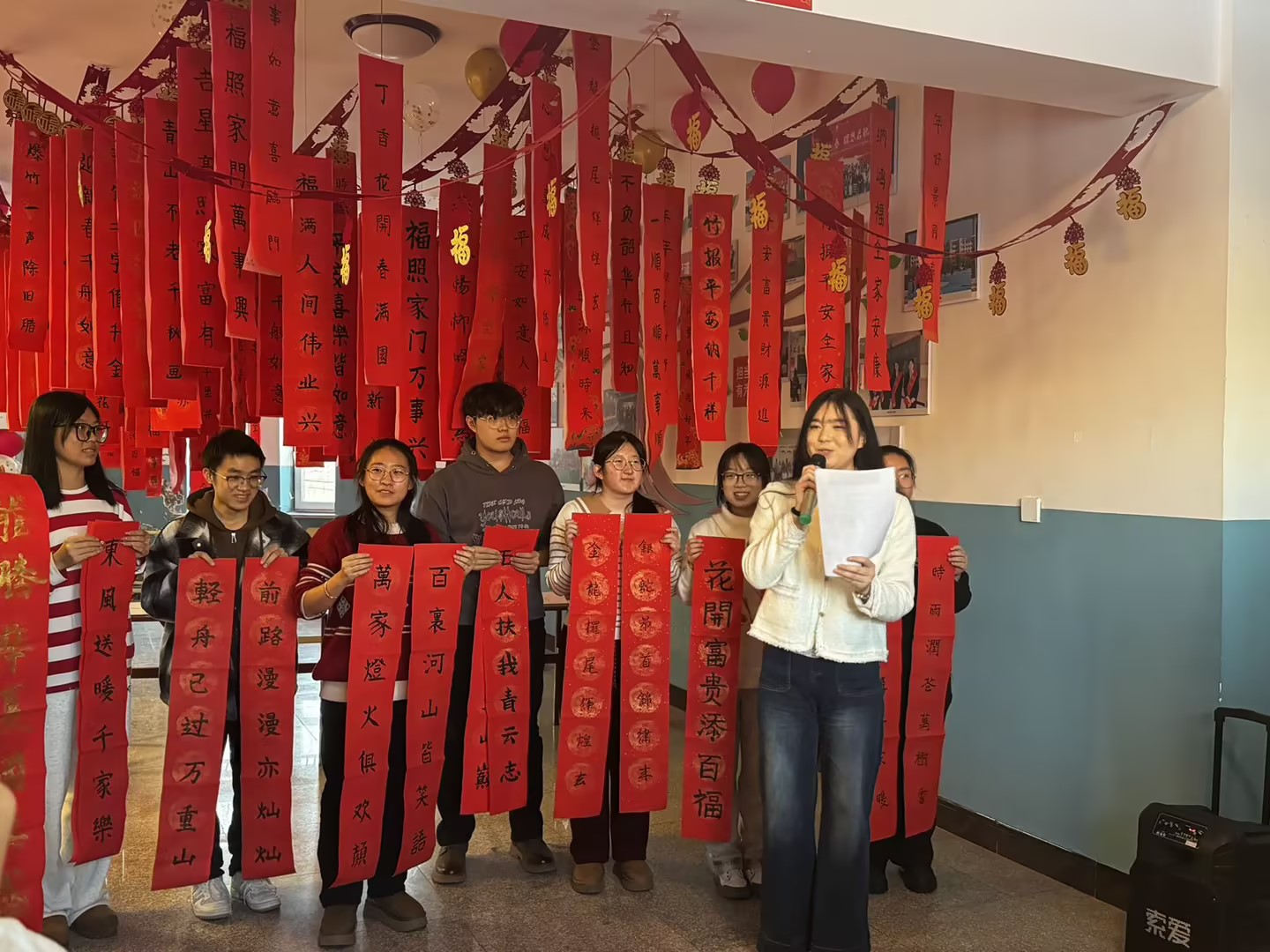 活动现场,学生精心展示的一副副对联墨香四溢,吸引师生们驻足欣赏。这些对联对仗工整、用词精妙,不仅蕴含着对新年的美好祈愿与祝福,也充分展现了中华传统文化的独特魅力。在欢快的背景音乐烘托下,同学们还现场挥毫泼墨进行写对联表演,他们满怀热忱、以笔为媒,尽情挥洒对中国传统文化的热爱与敬意,一笔一划间,寓意美好的对联跃然纸上,精彩的表演赢得阵阵喝彩。无论是笔法的娴熟运用,还是对对联内涵的深刻理解与表达,都彰显出同学们扎实的传统文化功底与积极向上的精神风貌。