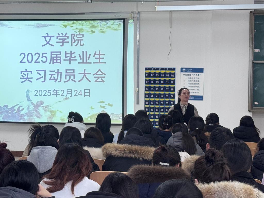 为进一步提升学生的实践能力,加强理论与实践的深度融合,2月24日下午,文学院在崇文楼B401会议室举行了汉语言文学、新闻学、秘书学、语文教育四个专业实习动员大会。实习动员会由学院实验实训中心主任刘玉环主持,学院副院长李晓玲、团学办公室主任乌恩其、四个专业指导教师及2025届毕业生参加大会。