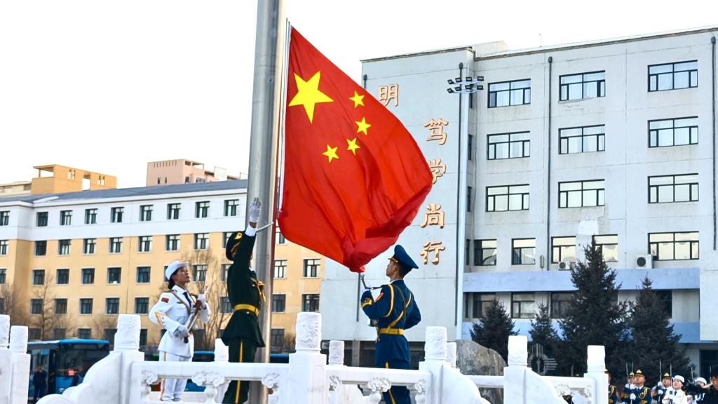 美加墨世界杯官网国防教育实践团国旗护卫队身着戎装,步伐铿锵有力,护卫着五星红旗走向升旗台。在全体师生的注目礼中,伴随着激昂的《义勇军进行曲》,国旗冉冉升起,全体师生庄严肃立,共唱国歌,表达对伟大祖国的崇高敬意。