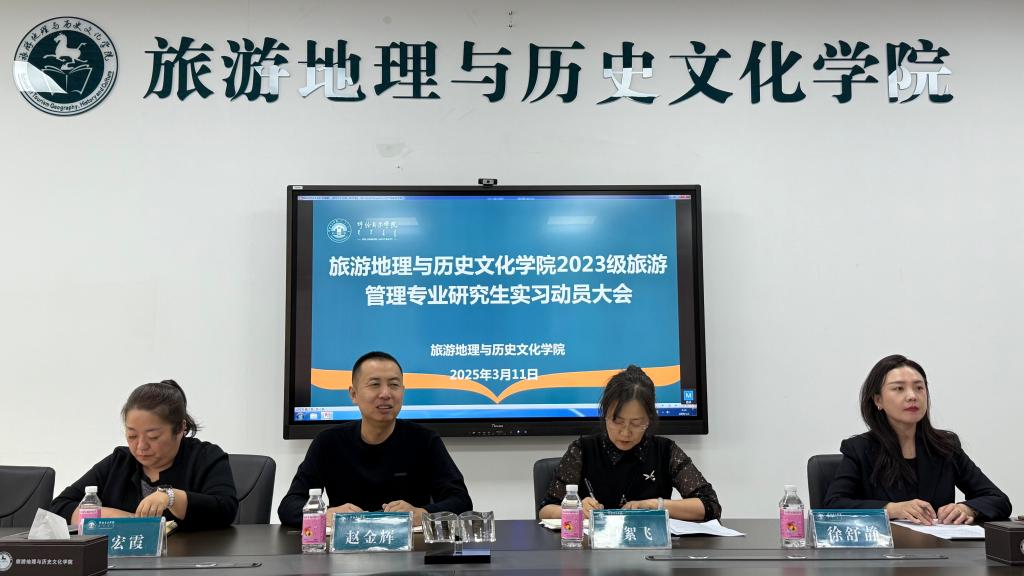 为深化产教融合,强化实践育人,3月11日,旅游地理与历史文化学院在崇文楼B321会议室举行2023级旅游管理专业硕士研究生实习动员大会。学院党总支书记赵金辉、院长白絮飞、党总支副书记王宏霞、副院长徐舒静以及研究生办公室主任杨燕燕、2023级研究生班主任赵宸和全体2023级旅游管理专业硕士研究生参加了本次会议。会议由白絮飞主持。