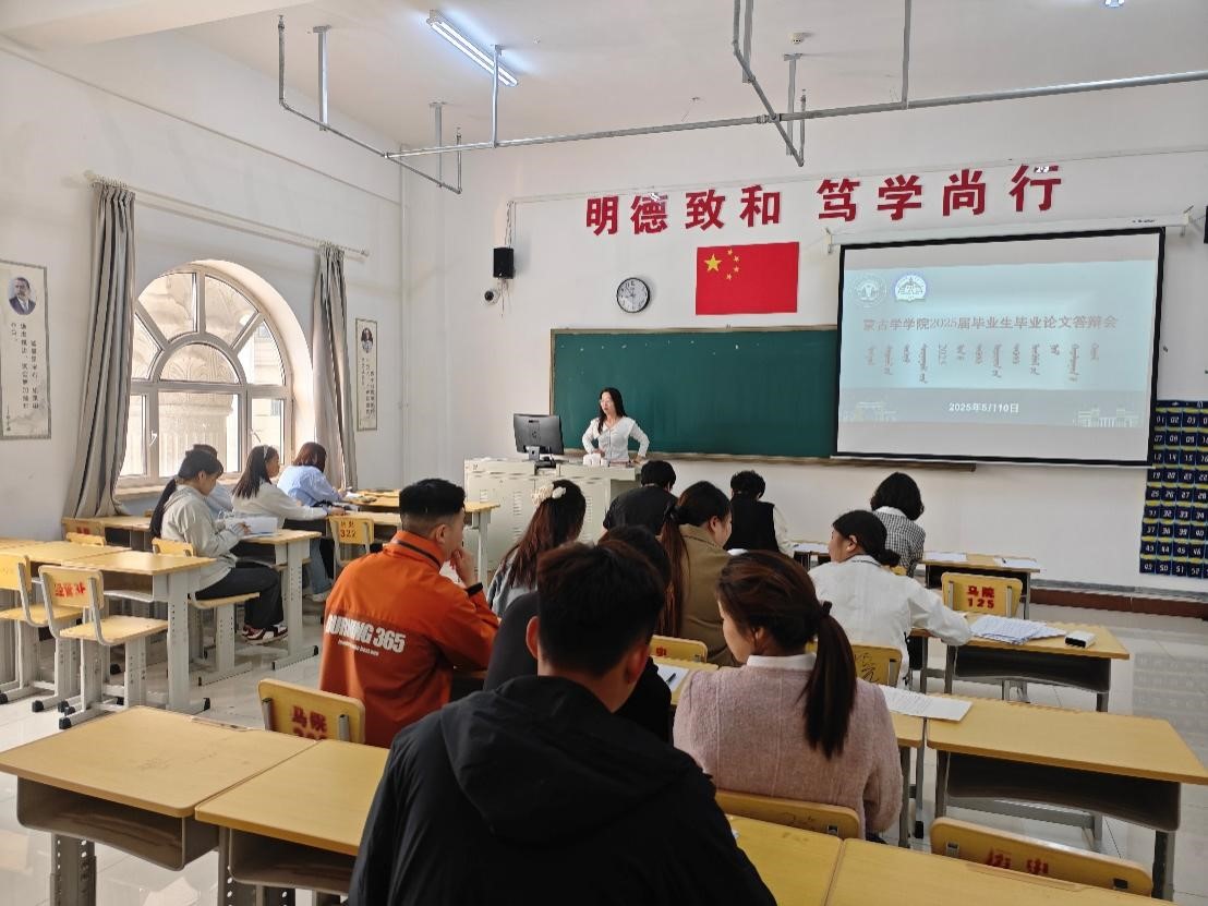 5月10日上午,蒙古学学院2025届中国少数民族语言文学本科生毕业论文答辩会在崇文楼B座222、224、228室有序开展。学院院长白秀峰、副院长小花、银花副教授分别担任本次答辩组长。本次答辩涵盖语言学、民间文学、现当代文学、中学教育等多个领域。为确保答辩工作高效、有序进行,学院将答辩划分为三个小组同步进行,12名教师和77名毕业生参与本次论文答辩。