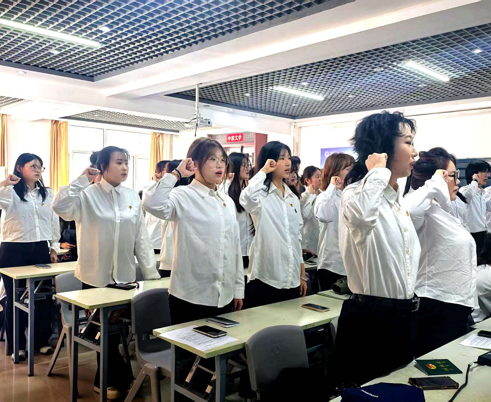 入团仪式在庄严的《光荣啊,中国共青团》歌声中拉开帷幕。 张巍巍、王雪菊等老师为新团员颁发团员证、佩戴团员徽章,熠熠生辉的团员徽章不仅是荣誉的象征,更代表着团员的责任与担当。 随后,全体新团员在领誓人的带领下,高举右拳,面向团旗庄严宣誓,铿锵有力的誓言响彻教室,老团员同步重温誓词,新旧两代团员的信仰在誓词声中完成接力。