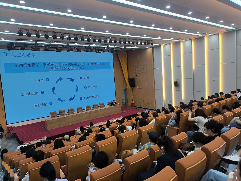 讲座中,高阳深入解析大模型技术底层逻辑,着重介绍AI在教学与工作场景中的高效应用方案,包括辅助写作、PPT制作、绘图、Excel数据处理、智能搜索及工作总结报告撰写等内容。