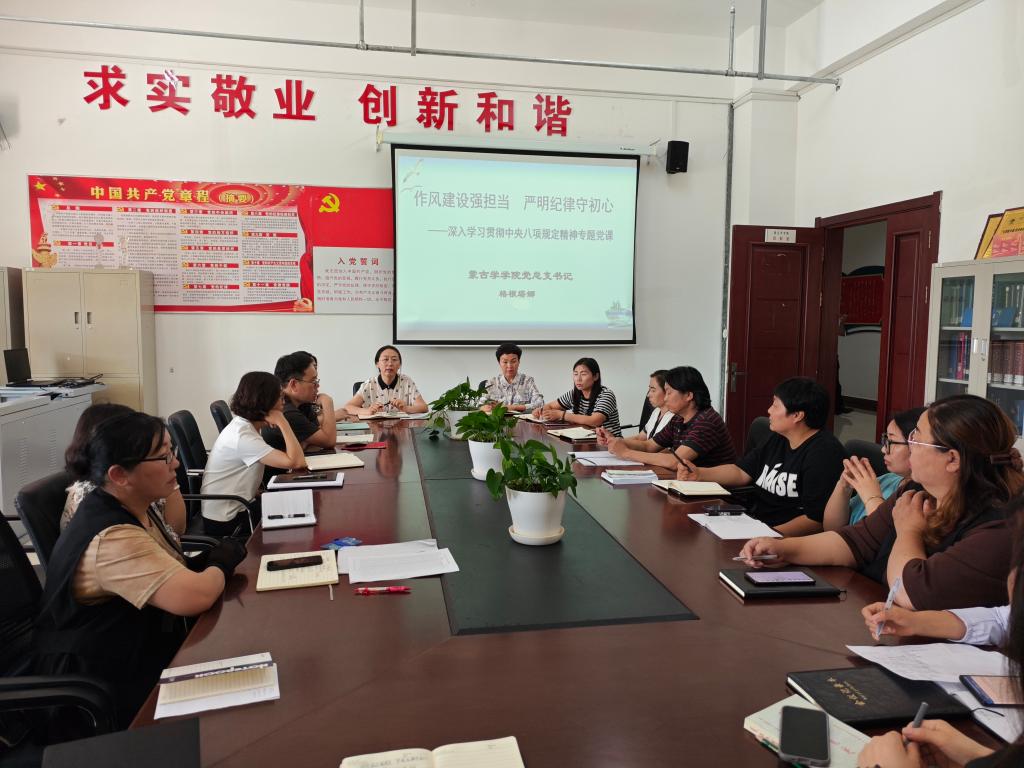 为深入贯彻中央八项规定精神学习教育,传达学习习近平总书记关于加强党的作风建设的重要论述,强化党员纪律与廉洁意识,6月26日上午,蒙古学学院党总支在崇文楼B221会议室开展纪律作风专题党课,学院党总支书记格根塔娜主讲,学院全体教职工党员参加。