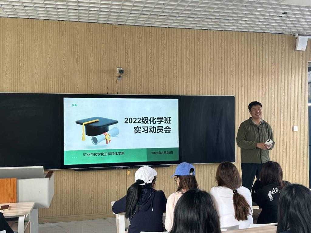 为帮助化学专业学生明确实习目标、规范实习流程、保障实习安全,确保实习工作有序开展,8月28日上午,矿业与化学化工学院在师专楼216教室召开2026届化学专业教育实习动员会议。学院副院长敖日格乐、化学系主任齐霞及2022级化学专业全体学生参加会议。