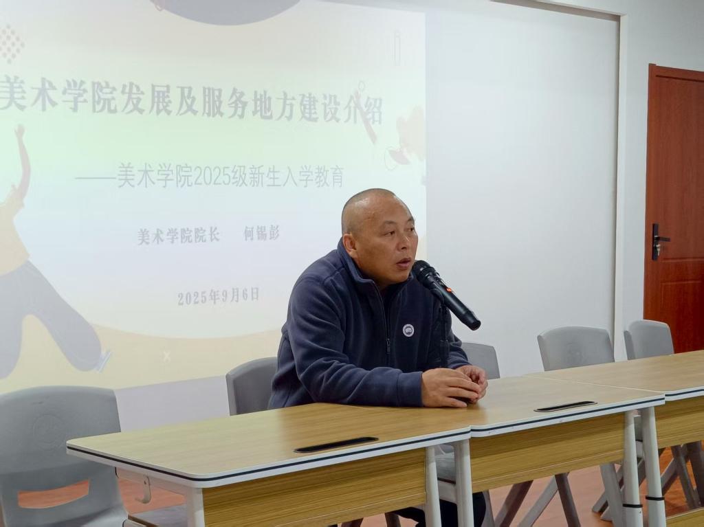何锡彭首先向全体新生表示欢迎,并勉励学子以大学为起点,在艺术探索中实现自我突破。随后,他系统梳理了美术学院自建院以来的辉煌历程,从艺术创作到教学科研,从文化传播到社会服务,学院以“传承与创新交融、艺术与实践共生”为理念,培育出大批兼具人文底蕴与时代担当的艺术人才。结合鲜活案例,何锡彭着重阐述了学院师生服务地方的实践成果:参与城市公共空间艺术改造,为街道注入美学活力;助力文化遗产保护,让传统技艺焕发新生;扎根乡村开展墙绘创作,赋能乡村振兴文化内涵。他还深入介绍了学院在产教融合、师资优化、就业创业等方面的创新举措,鼓励新生立足专业所长,将艺术理想融入国家战略与地方需求,以画笔为媒介回应时代命题。