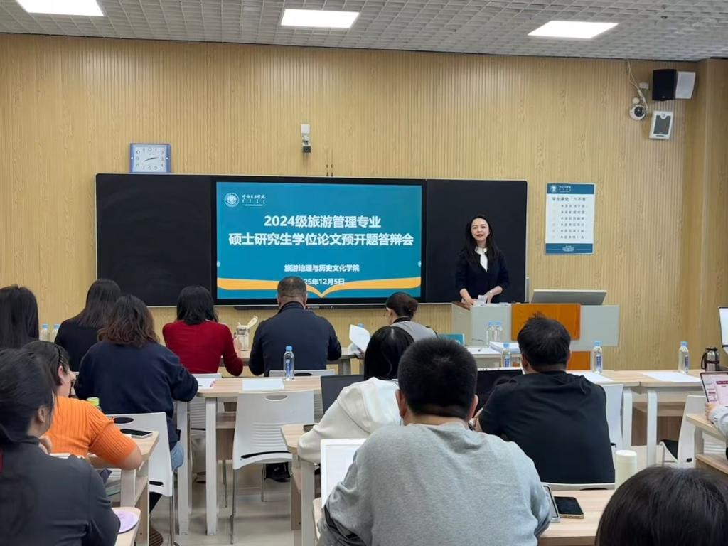 报告过程中,2024级研究生依次围绕选题依据、研究内容、研究现状、研究目标、理论基础、研究方法及创新点等方面汇报了个人的学位论文研究设计。从汇报内容来看,选题紧扣文旅融合发展趋势,涵盖草原旅游、工业旅游、非遗旅游、乡村旅游、生态旅游、旅游形象感知等多个视角。评委老师结合当前文旅产业实践热点,针对每位同学的选题主旨,就如何突出核心价值、完善论文逻辑框架、优化研究分析路径、加强可行性论证等方面提出了具体而深入的指导意见。在老师们专业细致点评与建议下,同学们对自身课题的学术定位与实践意义有了更深刻的理解,进一步明确了后续修改与完善的方向。