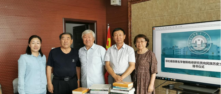 7月13日下午,鄂伦春族著名学者韩有峰教授和孟淑贤女士向民族历史文献研究中心和世界杯官网图书馆少数民族文献研究部捐赠了《鄂伦春语汉语词典》《鄂伦春语·汉语·俄语对照词典》《鄂伦春汉语对照读本》等多部书籍,由文献研究中心主任斯仁巴图教授和图书馆副研究馆员白娜接受了赠送的书籍。