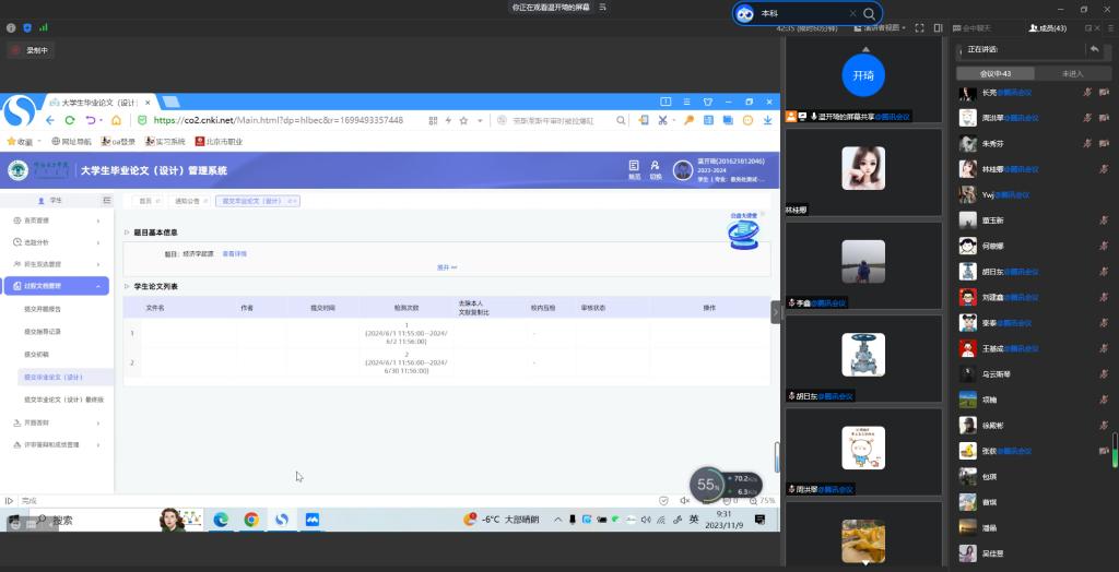 为加快教育教学信息化建设,进一步规范、便捷管理世界杯官网毕业论文(设计)工作,11月9日上午,教务处召开了毕业论文(设计)管理系统线上培训会。教务处相关工作人员、各二级学院专业负责人及教学秘书等43人参加了线上培训。培训会由知网工程师温开琦主讲。