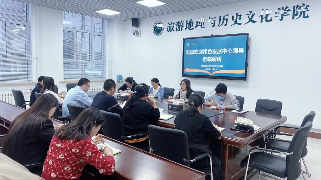 会上,白絮飞首先表明了本次调研针对师生生态环境保护意识进行调查的主要内容与要求,并进行提问。随后,赵金辉从绿色校园的硬件与软件两个方面阐述了高校校园绿化设施和师生环保意识的均衡发展。王宏霞从学生工作角度提出,学院以地理爱好者协会等学生社团为抓手,积极开展主题班会,将工作落实到学生的日常生活学习中。李前强介绍了学院硕士点建设、旅游管理专业研究生的培养、从生态旅游入手开展研究项目等情况。徐舒静和学院教师梅荣分享了从课程目标和课程思政两方面引导学生关注绿色发展的经验,并围绕校级相关项目、野外实践、调查工作等方面探讨了双方广泛的合作空间。最后,双方在会上达成一致目标,并表示将在今后工作中进一步强化交流合作,充分发挥双方的特色和优势,共同促进专业建设高质量发展。