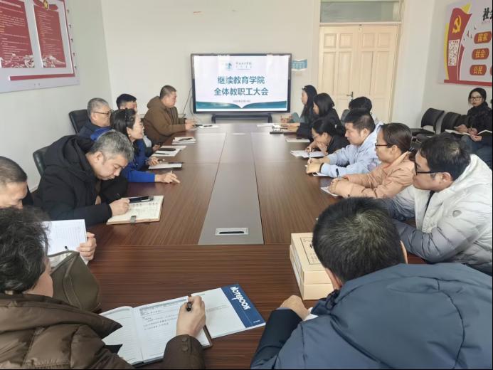 2月24日下午,继续教育学院在209会议室召开教职工大会,学院领导班子成员以及全体教职工参加了会议。会议由继续教育学院院长莎茹莉主持。