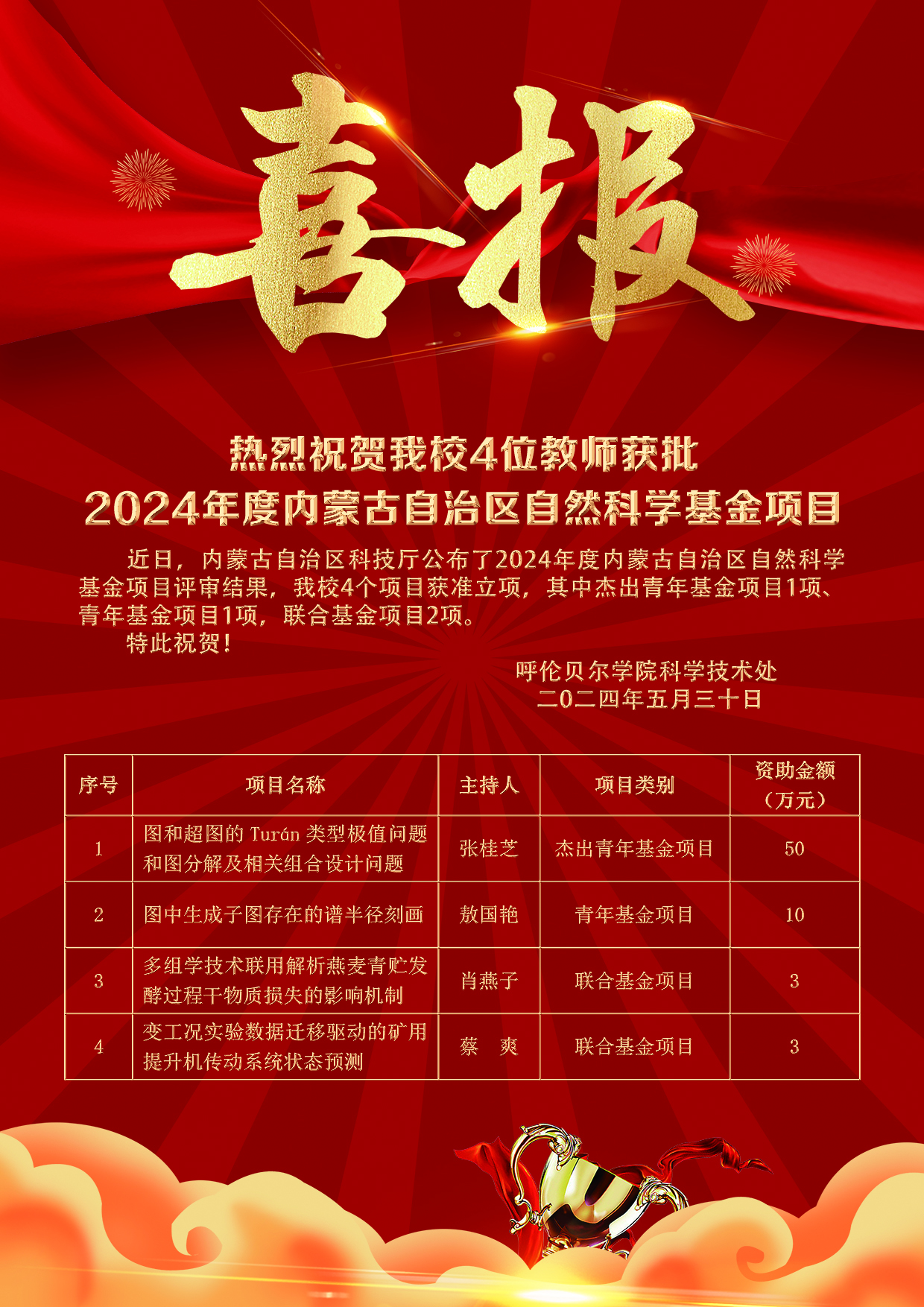 近日,内蒙古自治区科技厅公布了2024年度内蒙古自治区自然科学基金项目评审结果。世界杯官网教师张桂芝申报的《图和超图的Turán类型极值问题和图分解及相关组合设计问题》获批杰出青年基金项目,敖国艳申报的《图中生成子图存在的谱半径刻画》获批青年基金项目,肖燕子申报的《多组学技术联用解析燕麦青贮发酵过程干物质损失的影响机制》和蔡爽申报的《变工况实验数据迁移驱动的矿用提升机传动系统状态预测》获批联合项目。今年,世界杯官网...
