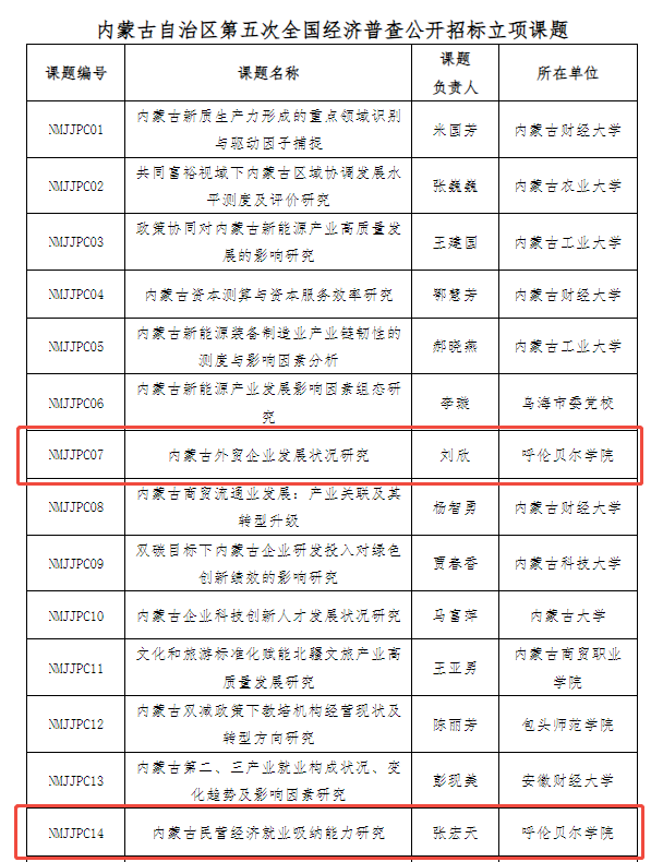 近日,内蒙古自治区第五次全国经济普查领导小组办公室发布《内蒙古自治区第五次全国经济普查课题立项公示》,世界杯官网张宏天老师主持申报的“内蒙古民营经济就业吸纳能力研究”和刘欣老师主持申报的“内蒙古外贸企业发展状况研究”项目喜获课题立项。今后,世界杯官网将进一步强化科研服务地方经济发展力度,进一步整合优秀人才及优质资源,为地方经济社会高质量发展及统计现代化改革贡献力量