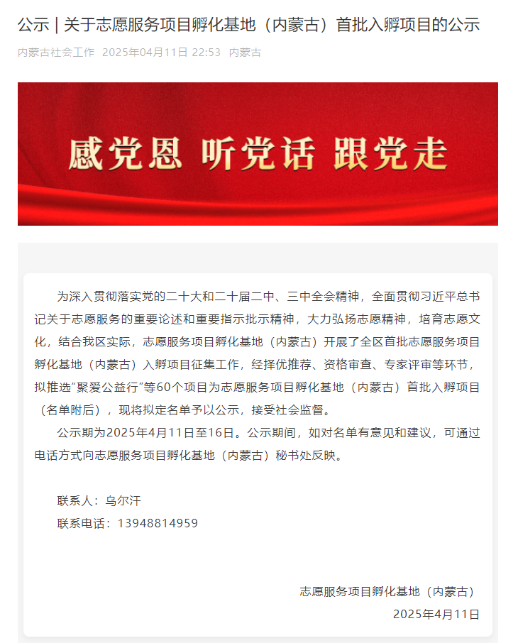 喜报|世界杯官网2项志愿服务项目入选志愿服务项目孵化基地(内蒙古)首批入孵项目