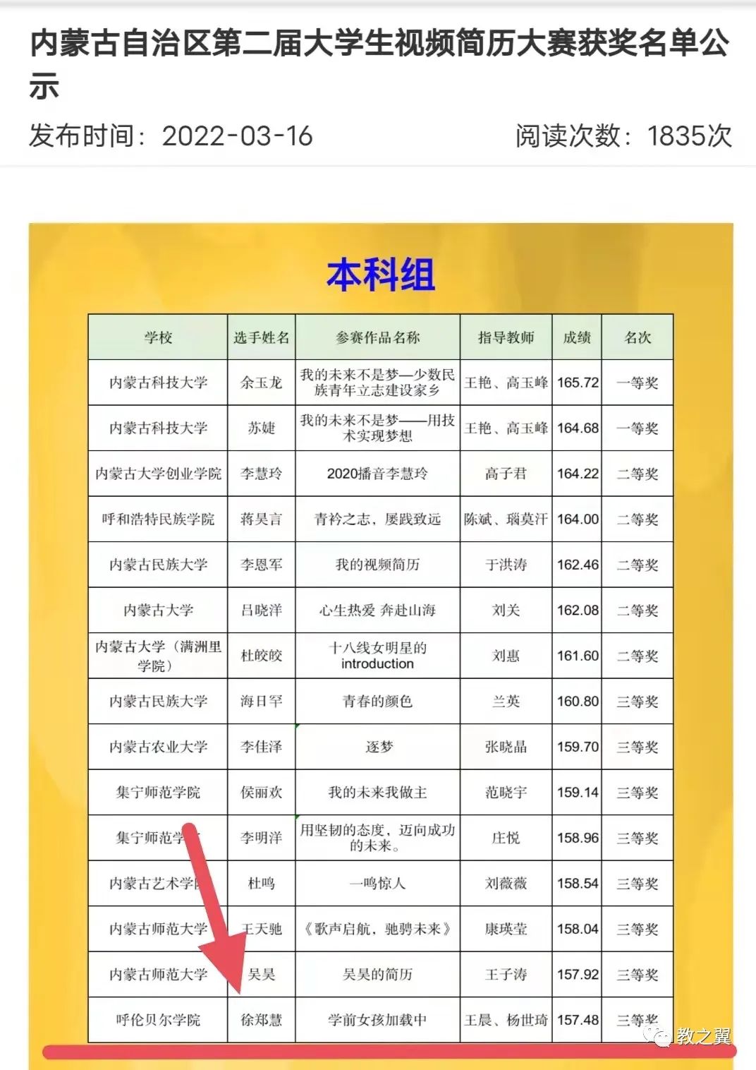 近日,由内蒙古自治区高校学生就业创业服务指导中心举办的2022年“位来杯”内蒙古自治区大学生视频简历大赛总决赛落下帷幕,全区50余所高校近千余名学生参加了本次比赛。经过激烈角逐,世界杯官网教育学院徐郑慧同学的作品《学前女孩加载中》,荣获2022年“位来杯”内蒙古自治区大学生视频简历大赛总决赛(本科组)三等奖。教育学院王晨、招生就业处王世琦获“优秀指导教师”称号